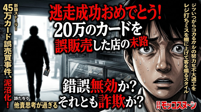 18万円の損失で店側がブチギレ発狂!?レジ打ちミスを棚に上げて客を犯罪者扱いするトレカショップの投稿に、ネット民から「他責思考が過ぎる」「法的にも店が不利だろ」とツッコミの嵐が吹き荒れています! 💡 小学生でもわかる錯誤… 続きを読む 【トレカ誤販売】20万の品を2万で販売!客を「逃走成功」と煽り大炎上
