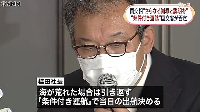 一方、桂田社長が会見で、海が荒れた場合は引き返す「条件付き運航」で当日の出航を決めたと説明したことに対し、国交省は、安全管理規程のルール上、「荒れるおそれがある場合は出航できない」とし「“条件付き運航”という考え方はない」と強調しました。