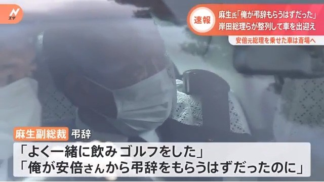 参列者によると麻生副総裁が弔辞を読み、「よく一緒に飲みゴルフをした」「俺が安倍さんから弔辞をもらうはずだったのに」と悔しさをにじませました。
