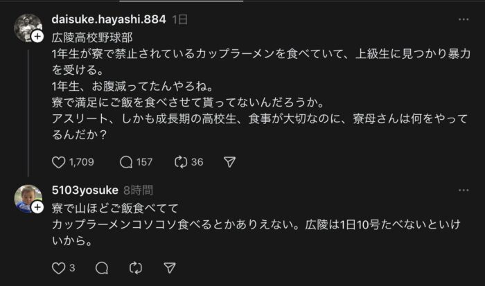 私が広陵の野球部だった春の選抜で優勝した時代、上下関係ひどくてカップ麺どころかスマホもなく寮に公衆電話があるだけ。(限られた10円玉わずかな時間でさえ、電話かける時は見張り役の先輩に監視される)どこにも逃げ場なくて、寮から夜逃げするやつもいた。