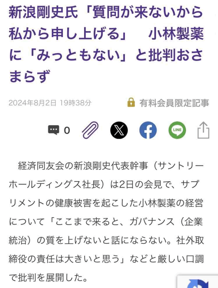 参考: 東洋経済オンライン, フィナンシャル・タイムズ, 朝日新聞, YouTube (サントリーHD新浪会長が辞任 物言う経営者 サプリ輸入で家宅 …), CNN.co.jp, YouTube (経済同友会の定例会見で経緯説明へ|TBS NEWS DIG), tokyoweekender.com, apnews.com