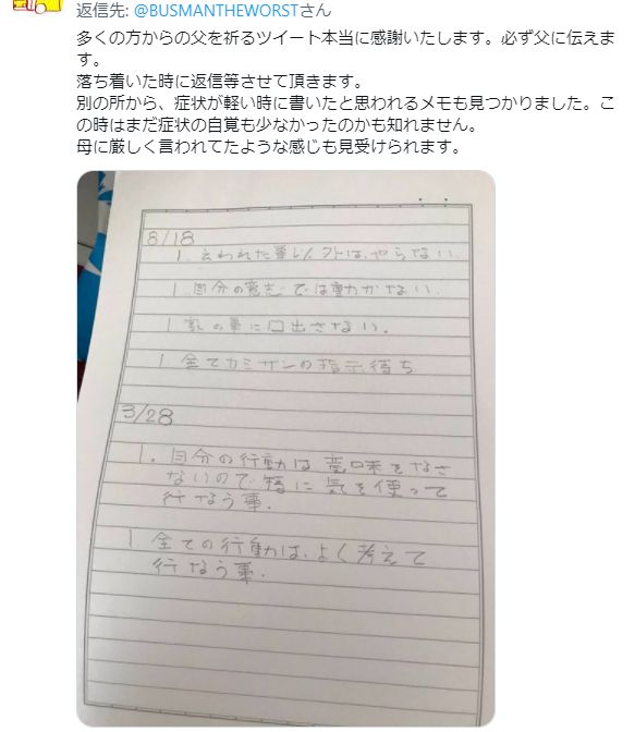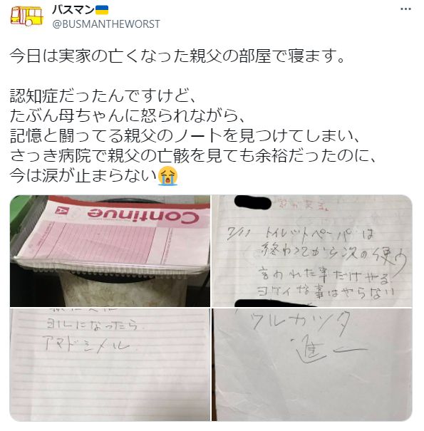 そして、認知症の父親のノートの画像。これは胸が苦しくなる。家族が介護すると、こういう状況になりがちというレスも、現実を突きつける。
