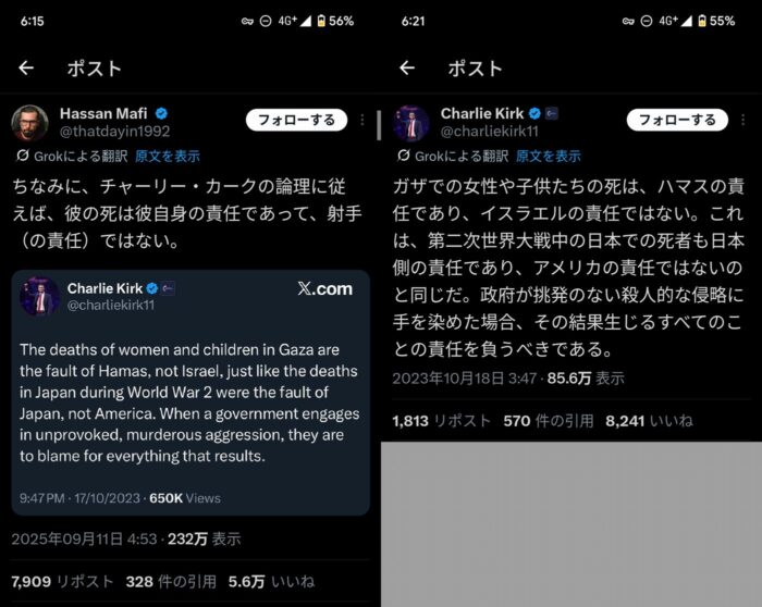 「左翼は暴力的」という主張が繰り返され、日本でも同様の事態が起きるのではないかという懸念まで出ているな。そんな中で「9条があってよかった」という意見には「国内での武力行使の可能性は残る」と冷静なツッコミが入る。アメリカのリベラルが「政治カルト化」しているという指摘もあり、思想の対立が極限状態に達しているのがわかる。