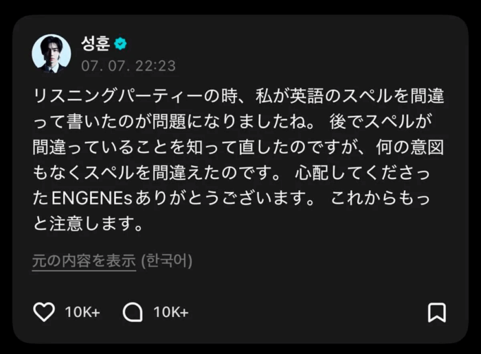 ソンフンさんは投稿を削除しましたが、ほかのメンバーも笑いながら “jap” と連呼したため、SNSで大炎上してしまったのです」(芸能記者)炎上を受けて、ソンフンは7月7日のXで、自身の発言に関して、《リスニングパーティーの時、私が英語のスペルを間違えて書いたのが問題になりましたね。後でスペルが間違っているのを知って直したのですが、何の意図もなくスペルを間違えたのです》と、“説明文” を掲載した。