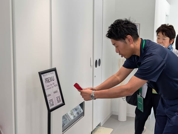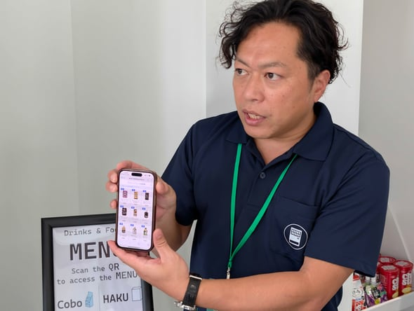HAKUは、前面がディスプレイになっていて、画像や映像を投影できる自動販売機。利用者はスマートフォンでQRコードを読み取り、端末の画面で商品を選び、キャッシュレス決済を行う仕組みだ。