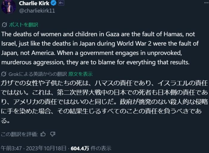 チャーリー・カーク氏の過去の過激発言が紹介されてるな。