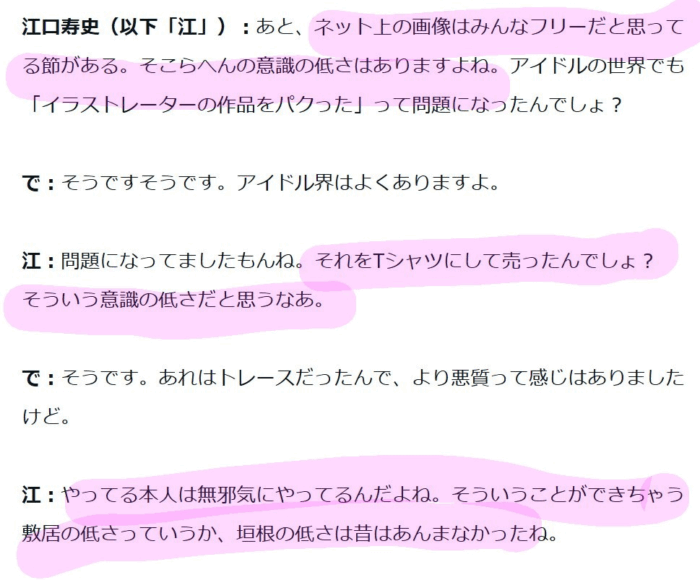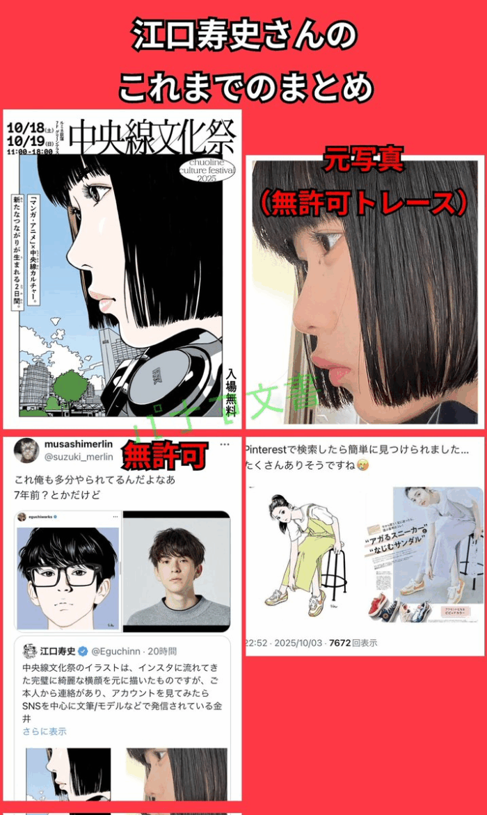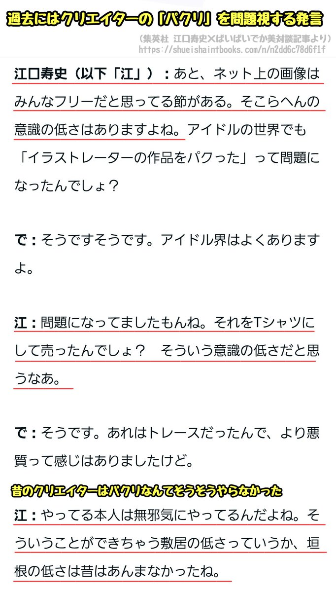 過去には江口氏自身が“クリエイターのトレパク”を問題視する発言もしておりブーメラン炎上中