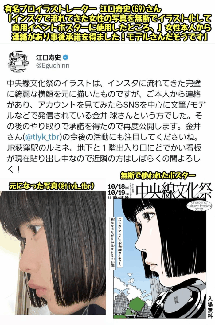大御所イラストレーター #江口寿史 氏、“インスタで流れてきた知らない日本人女性の写真”を女性本人に無断でまんまイラスト化