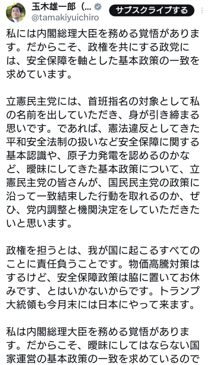 タマキンは立憲の政策無き数合わせ行動に乗っかって総理になるのは嫌だって