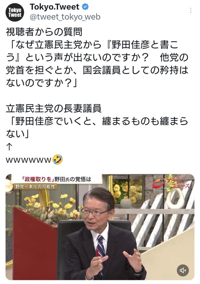 「日本初の女性総理」を阻止する以上、顔になった人間と政党はただでは済まない野田と立憲がその役割になることを良しとしないのは当たり前の話で