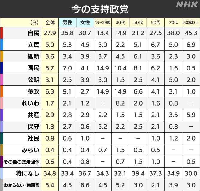 歴史探偵ニキが提示してくれた年代別支持政党データを見ると、立憲民主党の支持層は高齢者中心であることが見て取れる。政策重視というよりは二大政党制を望む層が多いという指摘も頷けるな。
