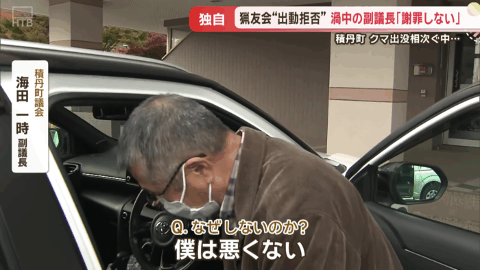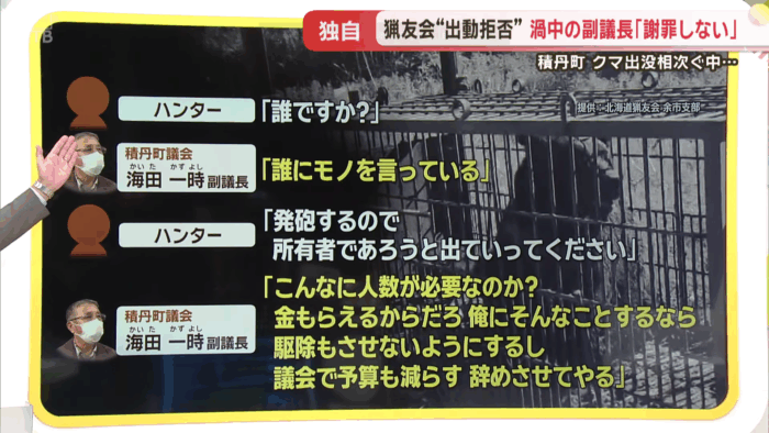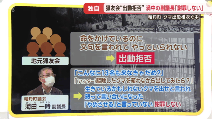 「気持ちは不安、ハンターが出動しないなら。警察のピストルでは対応できない」猟友会は町に対し、海田副議長の謝罪と駆除現場への第三者の立ち入りを禁止するよう求めています。