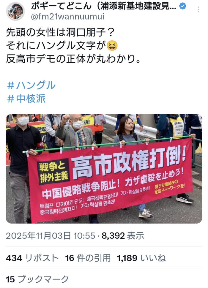 高市氏への反対、中国侵略戦争阻止、ガザ虐殺停止、そしてハングル文字。これだけ多様な主張が一つに集約される背景には、一体どのような意図があるのだろうか。