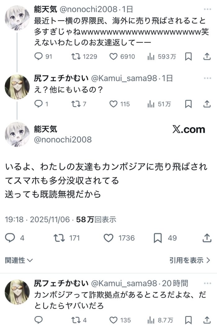 わたしの友達もカンボジアに売り飛ばされてスマホも多分没収されてる
