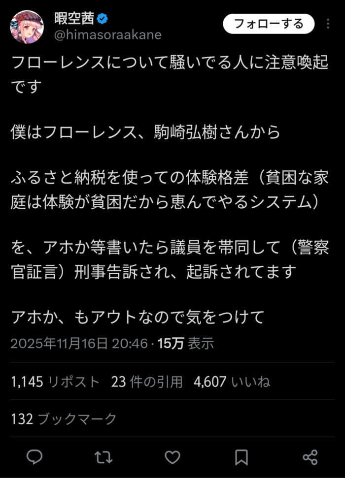 (フローレンスのふるさと納税こき下ろしたら議員連れて刑事告訴)