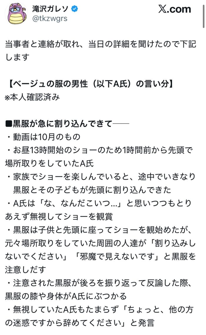 参考情報によると、この事件は2025年10月に発生し、SNSインフルエンサー滝沢ガレソ氏のX(旧Twitter)投稿で一気に拡散したようだ。原因は、黒い服の男性(黒T男性)が、既に場所取りをしていたベージュの服の男性(ベージュ男性)家族の前に強引に割り込んだことだとされている。