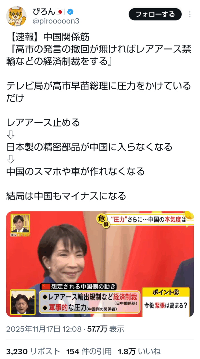 経済安全保障担当大臣、小野田紀美氏の「気に入らないことがあるとすぐに経済的威圧を行う国に依存しすぎるのはリスクだ」という発言が、ネットで大きな波紋を呼んでいる。今回のスレッドは、この発言を巡り、日本の対中経済依存と安全保障に関する熱い議論が繰り広げられた。果たして、この「正論」は現実的か?それとも机上の空論なのか?