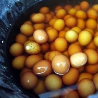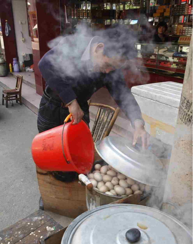露天商が尿入りバケツを後日回収し、ヒビをいれた卵を1日茹で、皮を向いて新たな尿で二度茹でし完成となります。