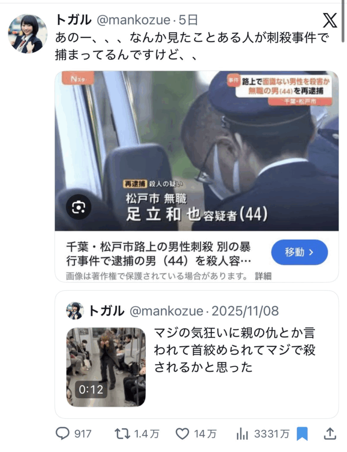 2025年11月、千葉県松戸市で発生した男性刺殺事件は、その後の展開で日本中に衝撃を与えました。事件直後、電車内で奇妙な行動を取る男性の動画がSNSで拡散され、多くの人々がその異様さに注目。しかし、その男性こそが殺人事件の容疑者であると判明し、公共空間に潜む危険性が改めて浮き彫りになったのです。