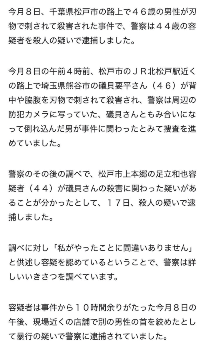 この事件では、北松戸駅前の路上で礒貝要平さん(46歳)がナイフで刺殺され、後に足立和也容疑者(44歳)が逮捕されました。 容疑者は被害者と面識がなく、凶器のナイフはインターネットで購入していたと供述しています。 電車内では、周囲を威嚇するような「ピーカブー」スタイルのポーズを取ったり、他の乗客の首を絞めるなどの異常行動を見せていました。
