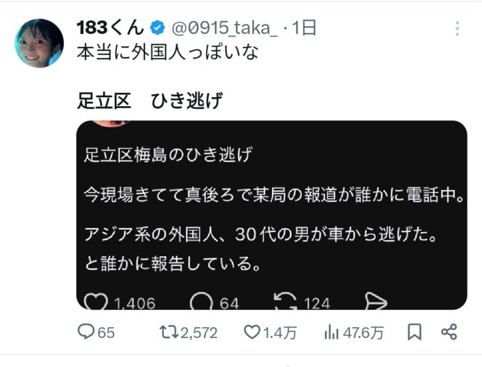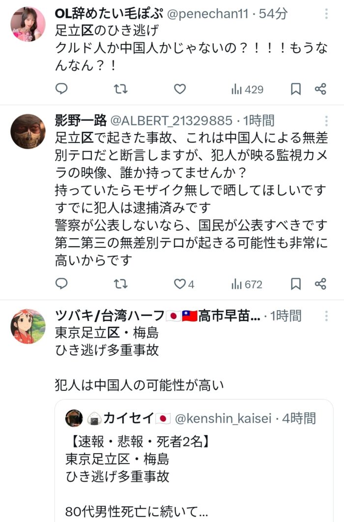 今回の足立区ひき逃げ事件では、犯人が日本人であるにも関わらず、インターネット上で「外国人犯行説」が急速に拡散しました。この現象は、一部の外国人による犯罪報道や不法滞在問題に対する社会的な懸念が、個別の事件において特定の民族への偏見や排外感情へと容易に転化してしまう現状を浮き彫りにしています。