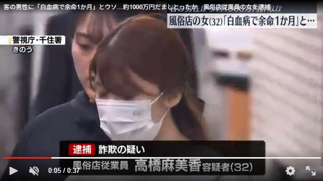 事件の概要: 風俗店勤務の32歳の女性が、客の60代男性に「白血病が再発し余命1ヶ月」と嘘をつき、入院費名目で約1000万円を詐取。最終的には総額3000万円以上を騙し取ったとみられています。