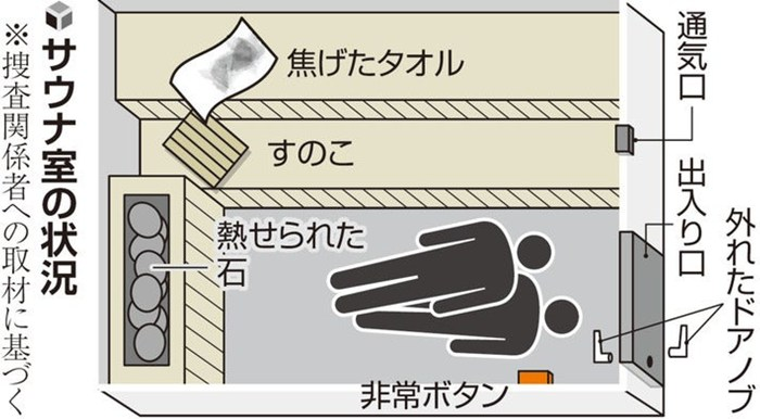 火災は、高温のサウナストーンにタオルが触れたことで起きたとみられるが、ある捜査関係者は「異常を知らせるために、夫婦が意図的にタオルを燃やした可能性もある」と指摘する。