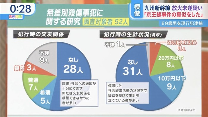 法務省「ジョーカー52人を調べたら交友関係ほぼなしが7割、収入なしか10万以下が8割でした」