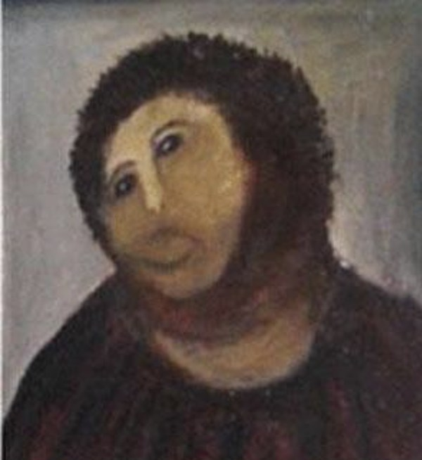 - 2012年、地元在住の高齢女性セシリア・ヒメネスが、劣化していたこのフレスコを「自分で修復」しようとして、キリストの顔が”サル”のような姿になってしまい世界的なミーム化(Ecce Homo → Ecce Mono)した。