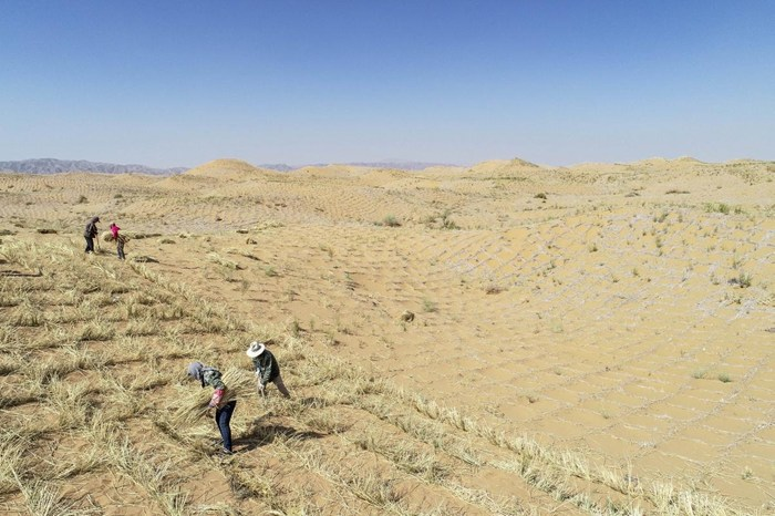 砂塵などが起きると、太陽光パネルが風を撹乱し、パネル設置箇所の砂が削れてしまい、砂塵によってパネルが転倒するなどの事故も起きた。そこで、砂漠周辺に自生をしている灌木の一種である梭梭などを植える試みがなされた。