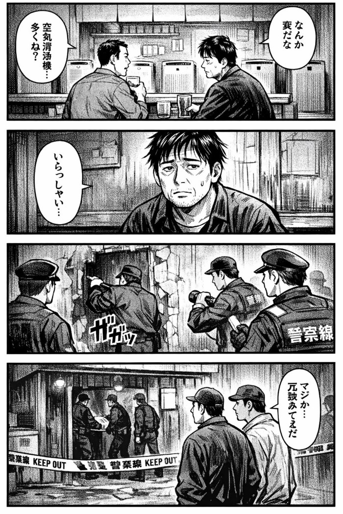 「店長元気ないなぁ、掃除しといたるわ!」なんて客がいたら、まさかの惨事が明るみに出るところだったぞ!そして、壁に遺体を隠す手口が「古典的ミステリーの定番」という指摘。日常の居酒屋が、一気にエドガー・アラン・ポーの世界に引きずり込まれるこの落差。観察力鋭い客の「空気清浄機5台」への違和感が、事件の重要な伏線として機能しているのが見事な展開だ。