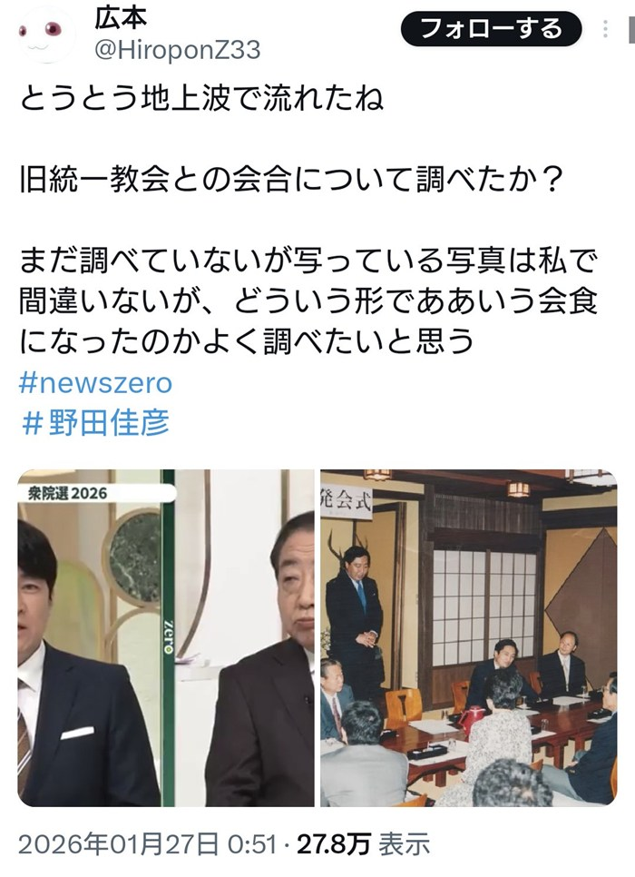 立憲・中道改革連合の野田佳彦共同代表に、旧統一教会(勝共連合)との過去の接点が直撃!流出した写真について本人が「私で間違いない」と認める事態となり、ネット上では「特大のブーメラン」と騒然になっています。これまで「壺」と他党を煽ってきた勢力の反応は…?