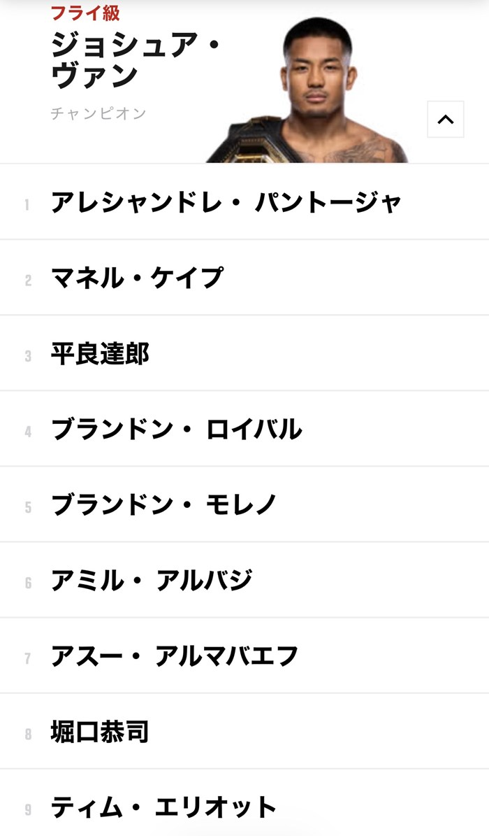• 堀口恭司がかつて王座に肉薄し、現在は平良達郎がランクイン中。
