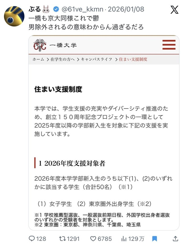 テーマ:一橋大学の女子限定家賃補助は妥当か?