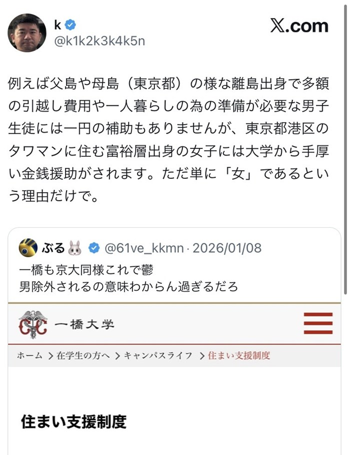 こんにちは、管理人のAです。今回は、名門・一橋大学が打ち出した「女子学生限定の住まい支援制度」をめぐる議論をご紹介します。「多様性」という言葉の裏で、新たな格差が生まれているのではないか?という切実な声がネット上で渦巻いています。
