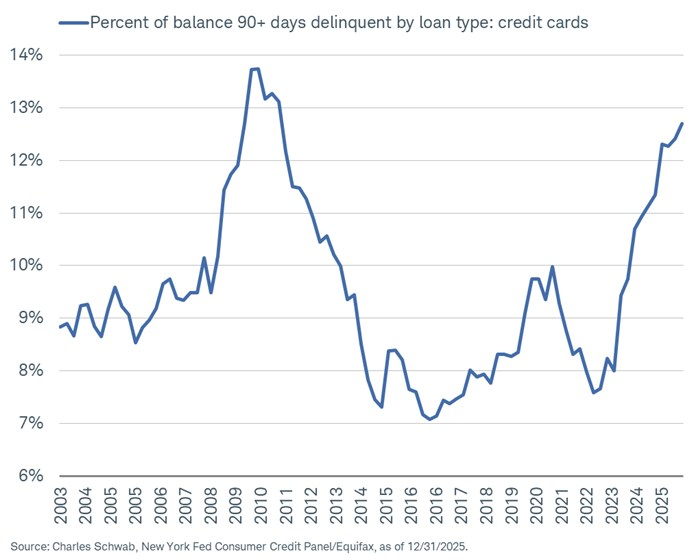 現在、クレジットカードの借入残高の12.7%が深刻な延滞(90日以上の未払い)に陥っており、これは歴史上2番目に高い水準です。