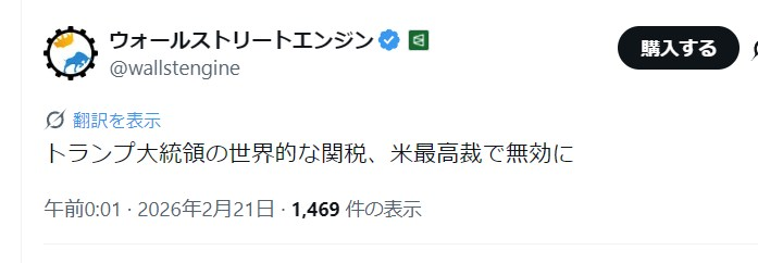 連邦最高裁が違法と判断した広範な関税措置の一部に代わる措置として、150日間にわたり全世界に10%の追加関税を課すと表明した。1974年の通商法122条に基づく大統領令になるとした。