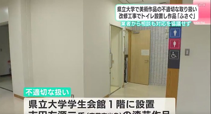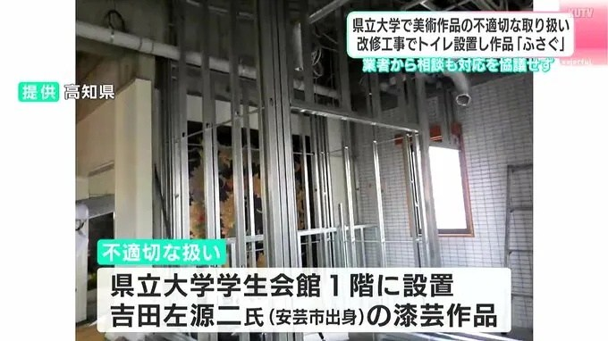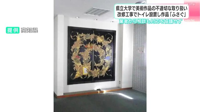 トイレの設置により美術作品が完全に見えなくなり、高知県立大学と高知県は「不適切な取扱い」だったと謝罪しました。