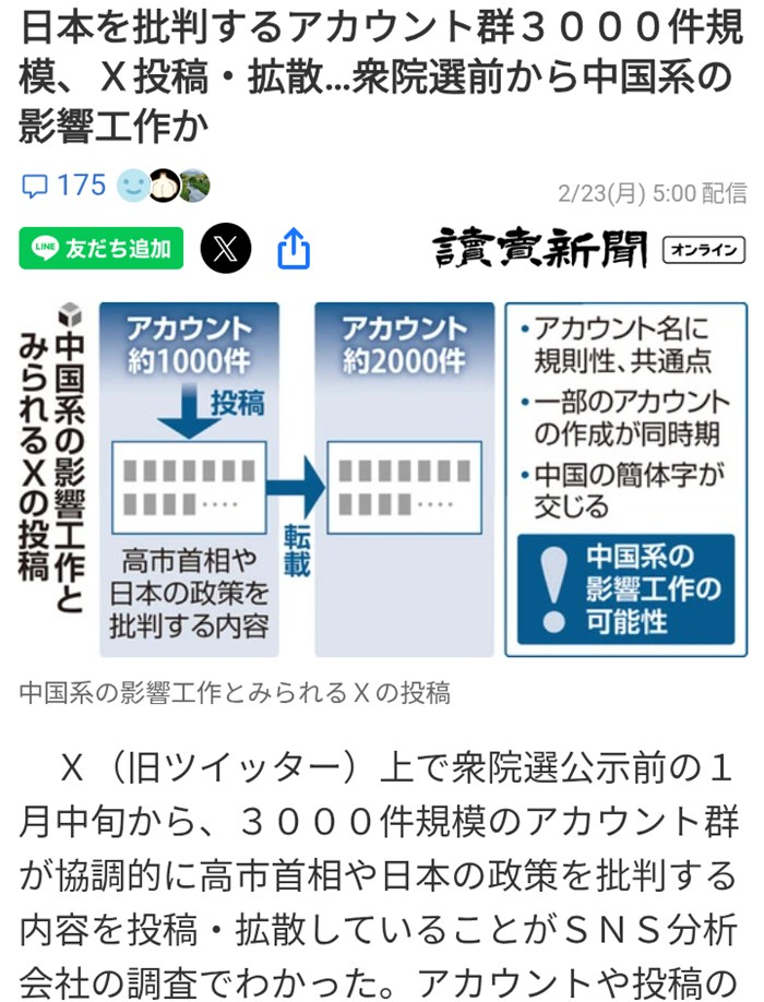 A:中国側の戦略として「自国に強硬な姿勢を取る政治家を排除したい」という意図が明確にあるからです。日経新聞(2026/2/23付)によると、特定の政治家を貶めるAI画像が400以上のアカウントで組織的に拡散されたことが確認されています。 - Q2:工作員を簡単に見分ける方法はある?