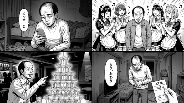 手取り20万の薄毛おじさんが、シャンパンタワーの快楽に溺れていく姿は現代のホラーそのもの。