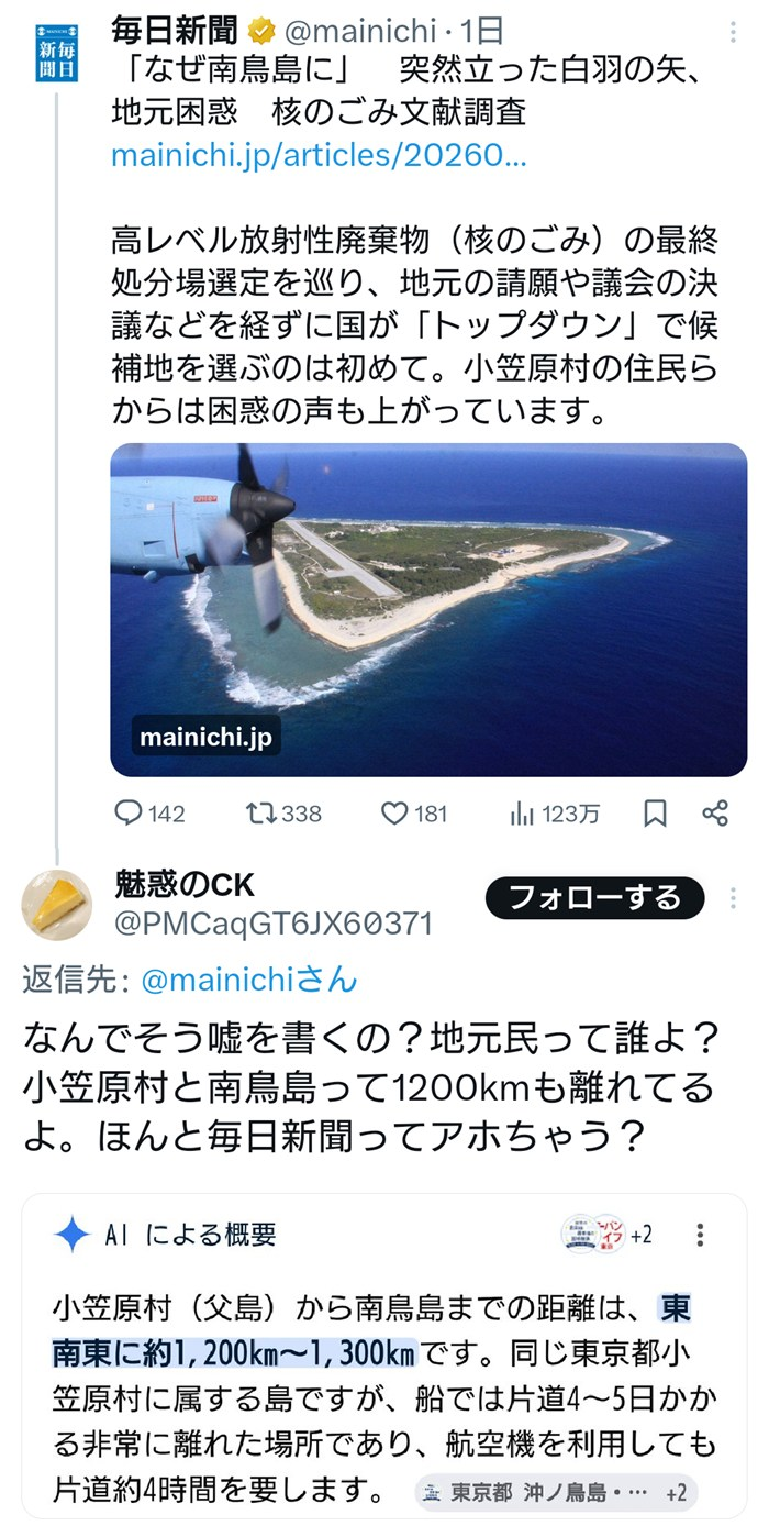 毎日新聞「なぜ南鳥島に…核のごみ文献調査に地元困惑」 ←住民0人の南鳥島の地元?🤔 [662593167]
