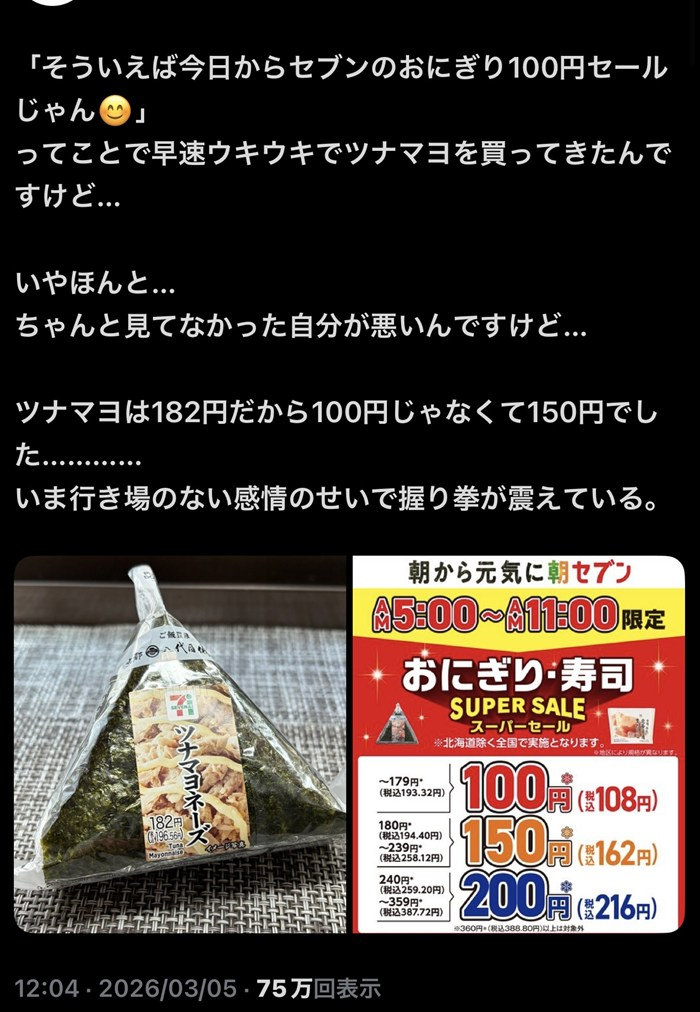 編集長の菊池だ。今回もまたセブン-イレブンが「やってくれた」な。おにぎり100円セールという甘い響きに誘われて店に行くと、そこには「※」という名の巨大な壁が立ちはだかっている。ネット民が「詐欺」「お通夜」と憤るその実態を、徹底的に暴いていくぞ。