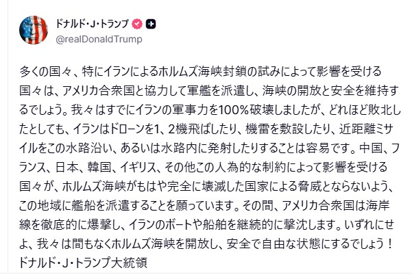 2026年3月11日、ドナルド・トランプ大統領は自身のSNS「Truth Social」において、ホルムズ海峡で機雷を敷設していたイラン軍艦船の破壊を報告しました。その中で「日本を含む全ての同盟国が、自国の船舶を守るためにこの海域へ軍艦を派遣することを願う」と投稿。これは事実上の有志連合への参加および軍事貢献の要求と受け止められ、世界中に激震が走っています。