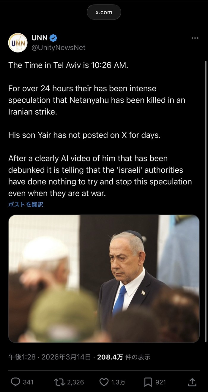 3月10日前後より、中国のWeiboやトルコの国営放送、SNS等で「ネタニヤフ首相がイランのミサイル攻撃により死亡、または負傷した」という未確認情報が急拡散。イスラエル側は沈黙を保っていますが、最新の会見動画に不自然な加工(AI特有の指の欠損や余り)が見られるとして、生死を巡る疑惑が世界中で再燃しています。