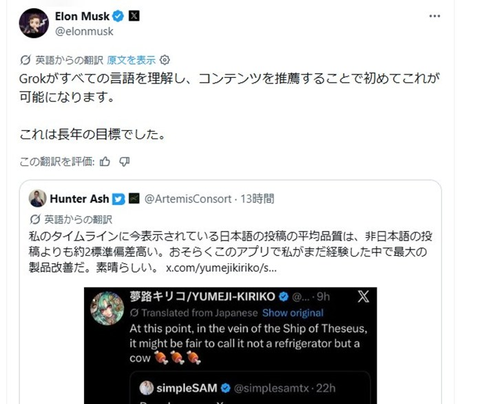 自動翻訳されて世界が広がっていく感じが嬉しくて投稿してみた。ありがとう、Elon MuskとGrok。情報元:世界との繋がりを喜ぶポスト