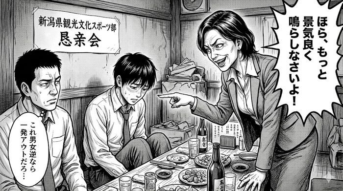 2025年7月、新潟県観光文化スポーツ部が開催した懇親会(暑気払い)にて、部長級の50代女性管理職が、部下の男性職員に対し、性的意味合いを想起させる侮辱的な余興を強要しました。