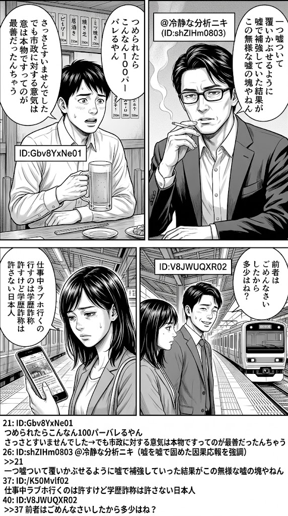 26: ID:shZIHm0803 @冷静な分析ニキ(嘘を嘘で固めた因果応報を強調)