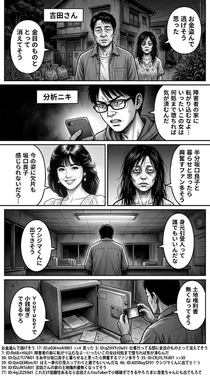さらに深刻なのは、彼女が外部の悪質な人間(ヤカラ)を引き入れ、吉田さんを籍に入れさせていびり終わらせる可能性を指摘する声です。