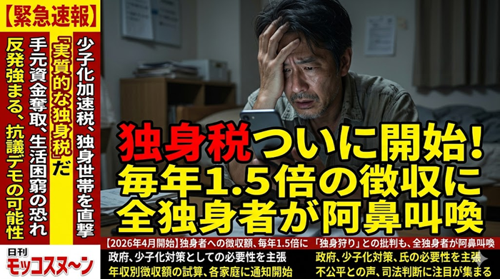逃げ場なしの「独身狩り」がついに始まる!?2026年4月から導入される新制度に、ネット上では「実質的な独身税だ」と怒りの声が爆発。将来への希望が次々と徴収されていく現代日本のリアルな叫びを刮目せよ。