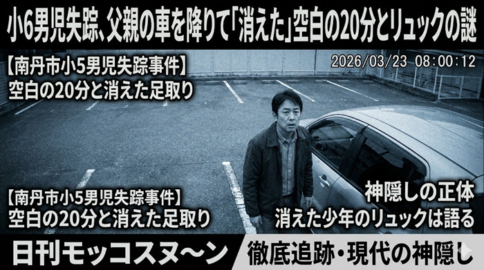 学校の目の前で、愛する我が子が忽然と姿を消す。防犯カメラの死角、見つからない目撃者、そして後出しのように山中で発見された「濡れていないリュック」。ネット上の声が過去のトラウマ事件を想起し、震えながらも核心に迫る禁断の考察録。